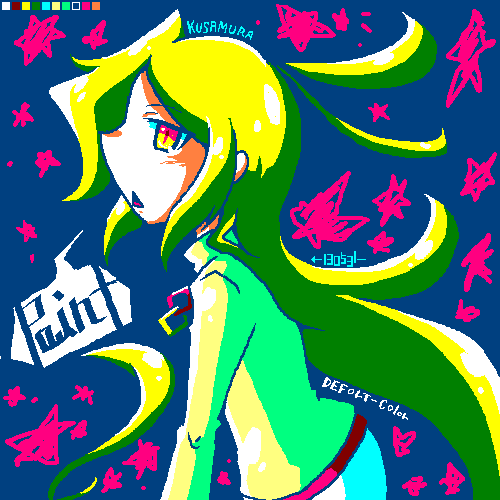Winのアクセサリに自動で入ってるペイント(XP以前のほう)で全部描き描きした。それだけだとただの劣化になるだろうからパレットもデフォルトで。デコデコバリバリの原色。